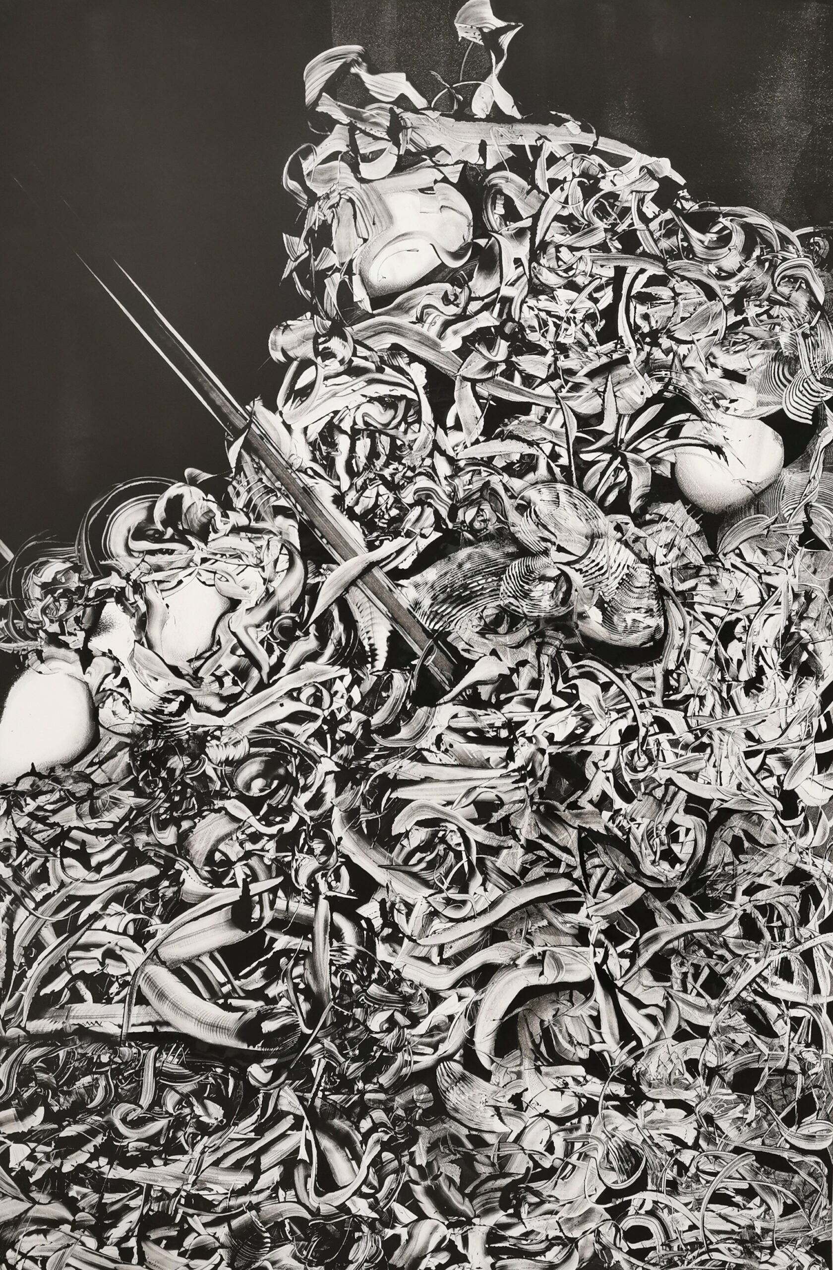 Ce plasticien utilise l’intelligence de la main, sur des artères en mouvement, celles qui vont plus tard oxygéner sa peinture. Nous pouvons constater que nous retrouvons dans ces œuvres des formes anatomiques, la chair à vif, les viscères enchevêtrés qu’il a explorés lors de ses actes médicaux sont inlassablement transcendés dans une œuvre où l’instantanéité et le hasard ont toute leur place.